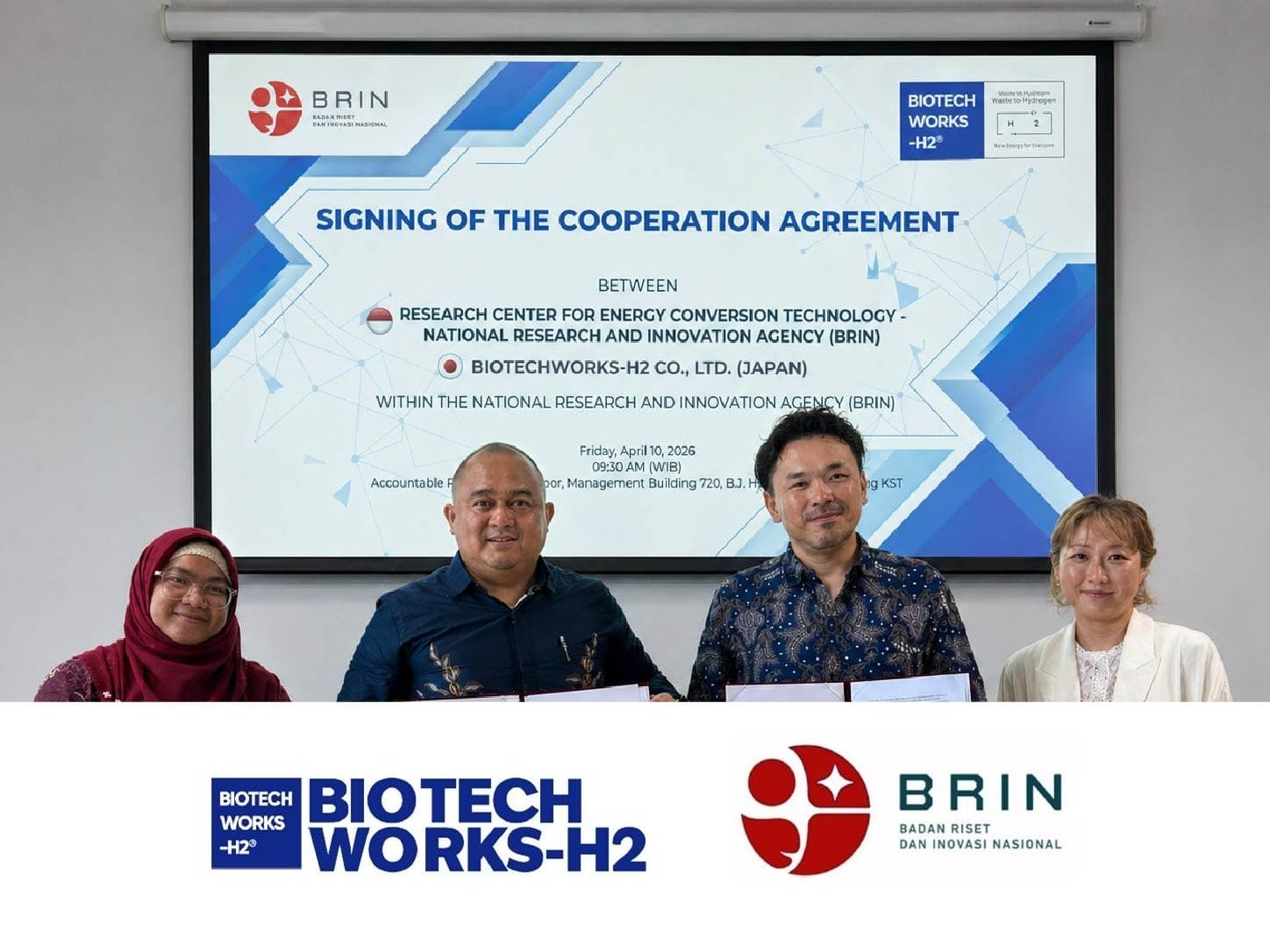 株式会社BIOTECHWORKS-H2(本社:東京都渋谷区、代表取締役CEO:西川明秀、以下「BTW-H2」)は、インドネシア国家研究イノベーション庁(Badan Riset dan Inovasi Nasional、以下「BRIN」)のエネルギー変換技術研究センター(Pusat Riset Teknologi Konversi Energi / PRTKE)と、Waste-to-Energy(WtE)技術に関する研究協力協定(Perjanjian Kerja Sama)を2026年4月10日に締結いたしました。